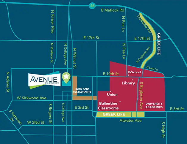 Welcome to The Avenue on College—where student living meets unmatched walkability in the heart of Bloomington. Perfectly positioned just steps from Indiana University, our community places you at the center of everything: campus, coffee shops, dining, nightlife, and local hotspots are all within easy reach. Whether you’re grabbing coffee before class, meeting friends for dinner, or exploring the local scene, Avenue on College brings everyday convenience and endless campus energy right to your doorstep. It’s all about where you live and where you’re connected to—and here, that’s everything.
